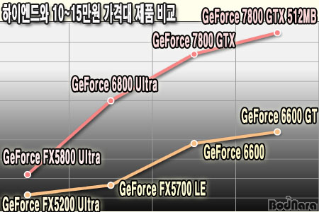 µû¶ó¼­ À̷лóÀ¸·Î´Â ÇöÀçÀÇ ±×·¡ÇÈ Ä«µå ¼º´ÉÀº GeForce 7800 GTX 512MB±îÁö ¿Ã¶ó¿ÔÁö¸¸, 10~15¸¸¿ø´ë Á¦Ç°µéÀÌ ÁÖ·ÂÀ̶ó°í ÇÒ ¼ö ÀÖ´Â ½ÃÀå¿¡¼­´Â GeForce 6600 GT±îÁö°¡ ¹ßÀü ´Ü°è¶ó°í ÇÒ ¼ö ÀÖ´Ù. GeForce 6600 GT¿Í 7800 GTX 512MB »çÀÌÀÇ ÆøÀº ÀÏ¹Ý À¯Àúµé¿¡°Ô À־´Â °ø¹éÀ̳ª ´Ù¸§¾ø´Â °ÍÀÌ´Ù.