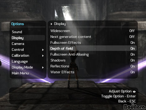 ¿É¼Ç ¼³Á¤Àº µð½ºÇ÷¹ÀÌ ºÎºÐ¿¡¼­ ¼³Á¤ÀÌ °¡´ÉÇÏ¸ç ±×¸²ÀÚÈ¿°ú¿Í ¹Ý»ç È¿°ú ±×¸®°í ¹° È¿°ú¿Í FSAA µîÀ» ¼³Á¤ÇÒ ¼ö ÀÖÀ¸¸ç ½Éµµ¸¦ Ç¥ÇöÇÏ´Â Depth of field È¿°ú´Â Fullscreen Effects ¿É¼ÇÀÌ È°¼ºÈ­ µÇ¾úÀ» ¶§¸¸ Àû¿ëÀÌ °¡´ÉÇÏ´Ù.