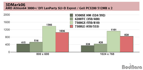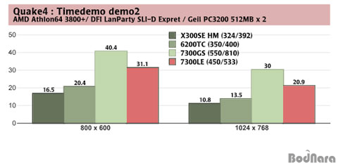 ¾ÊÀº °á°ú¸¦ º¸¿©ÁÖ°í ÀÖ´Ù. 7300GS´Â °¡Àå ³ôÀº ¼º´ÉÀ» º¸¿©ÁÖ°í ÀÖÀ¸¸ç, 7300LE, 6200TC,