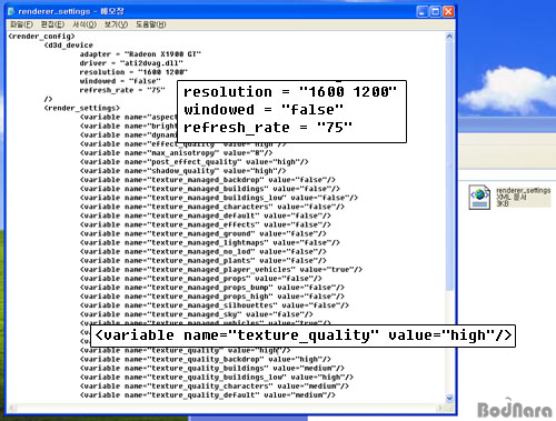 renderer_settings¶ó´Â ¿É¼Ç ÇÁ·ÎÇÊ ÆÄÀÏÀ» Á÷Á¢ ¼öÁ¤ÇÏ¸é °Á¦·Î °ÔÀÓÀÇ ÇØ»óµµ¿Í ÅØ½ºÃÄ Ä÷¸®Æ¼¸¦ ³ôÀÏ ¼ö ÀÖÁö¸¸, ÀÌ·± ±âº» ¿É¼Ç Á¦ÇÑÀº »ó´ç¼öÀÇ 256MB ±×·¡ÇÈ ¸Þ¸ð¸®¸¦ °¡Áø À¯ÀúµéÀ» ±âºÐ³ª»Ú°Ô ÇÑ´Ù. ±×·¡ÇÈ Ä«µåÀÇ ¸Þ¸ð¸®°¡ 256MB¶ó¸é GeForce 7800 GTX´ø GeForce 6600ÀÌ´ø ¸ðµÎ 1600x1200 ÀÌÇÏÀÇ ÇØ»óµµ¿¡ Medium±Þ ÅØ½ºÃÄ Ä÷¸®Æ¼¸¦ »ç¿ëÇÒ ¼ö¹Û¿¡ ¾ø±â ¶§¹®ÀÌ´Ù.