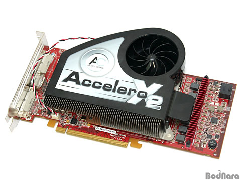 Arctic-Cooling Accelero X2´Â ATI X1800, X1900½Ã¸®Á Áö¿øÇÏ´Â Äð·¯·Î 60mm Å©±â¸¦ °¡Áö¸ç, 2000RPMÀ¸·Î ÀÛµ¿µÇ´Â Ä𷯸¦ ÀåÂøÇϰí ÇÃ¶ó½ºÆ½ ÀçÁú·Î È÷Æ®½ÌÅ©¸¦ °¨½Î°í ÀÖ´Ù. ¾Õ¼­ÀÇ µÎ Ä𷯿ʹ ´Ù¸£°Ô ÈÄ¸é ¹èÃâ ¹æ½ÄÀÌ ¾Æ´Ï¶ó ½½·Ô ¹æÇâÀ¸·Î ¹èÃâµÉ ¼ö ÀÖ´Â ±¸Á¶ÀÌ´Ù. È÷Æ®½ÌÅ©´Â 64°³ÀÇ ¾Ë·ç¹Ì´½ ÀçÁú·Î ±¸¼ºµÇÁö¸¸, GPU¿Í Á¢ÃËÇÏ´Â ºÎºÐÀº ±¸¸® ÀçÁúÀ» ÀÌ¿ëÇϰí 3°³ÀÇ È÷Æ®ÆÄÀÌÇÁ¸¦ Ãß°¡ÇÏ¿© º¸´Ù ºü¸¥ ¿­Àüµµ¿Í È¿À²À» ³ô¿©ÁØ´Ù. Àü¿øºÎ¸¦ °ÅÃÄ Äð·¯ ³»ºÎ·Î °ø±â°¡ À̵¿ÇÒ ¼ö ÀÖ´Â ÀÛÀº Åüdz ºÎºÐµµ Á¦°øÇÏÁö¸¸, ÀÛÀº Æí¿¡ ¼ÓÇϱ⠶§¹®¿¡ Á¤Ç° Ä𷯺¸´Ù´Â »ó´ëÀûÀ¸·Î ¸¹Àº °ø±âÀÇ À̵¿Àº ±â´ëÇÒ ¼ö ¾ø´Ù.