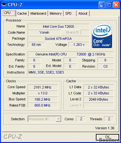 ¶È°°Àº ¼³Á¤°ú ºÎǰÀ» »ç¿ëÇÏ´Â ½Ã½ºÅÛ¿¡ CPU¸¸ Core 2 Duo¿Í Core Duo¸¦ ½è±â ¶§¹®¿¡ Å×½ºÆ® °á°ú Â÷ÀÌ´Â CPU ¼º´É Â÷ÀÌ ¶§¹®À̶ó ÇÒ ¼ö ÀÖ´Ù. ÀÎÅÚ Core Duo T2600 ÇÁ·Î¼¼¼­´Â FSB 667MHz(166x4)¿¡ 13¹è¼ö¸¦ Àû¿ëÇØ 2.16GHzÀÇ µ¿ÀÛ Å¬·°À» Áö¿øÇϰí ÀÖÀ¸¸ç L2 ij½Ã´Â 2MB·Î 2°³ÀÇ Äھ ÇϳªÀÇ L2 ij½Ã¸¦ °øÀ¯ÇÏ´Â ¹æ½ÄÀÌ´Ù. Pentium M¿¡¼­ Áö¿øÇÏÁö ¸øÇß´ø SSE3 ±â´ÉÀÌ µé¾î°¬À¸³ª EM64T³ª SSE4´Â Áö¿øÇÏÁö ¸øÇÑ´Ù.