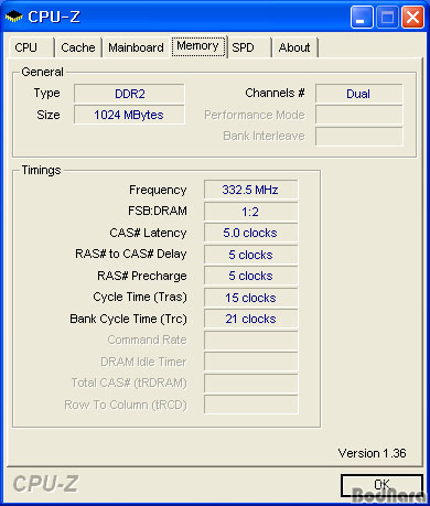 ¸Þ¸ð¸® Á¤º¸´Â 2°³ÀÇ DDR2-667 512MB ¸Þ¸ð¸®¸¦ »ç¿ëÇØ µà¾ó ä³Î 1GB ¸Þ¸ð¸®¸¦ ±¸¼ºÇßÀ¸¸ç, ³ëÆ®ºÏ ¹ÙÀÌ¿À½º ¼³Á¤ È­¸é¿¡¼­ ¸Þ¸ð¸® ŸÀÌ¹Ö Á¶Àý ¿É¼ÇÀÌ ¾øÀ¸¹Ç·Î ÇØ´ç ¸Þ¸ð¸®ÀÇ SPD Á¤º¸¿¡ µû¶ó DDR2-667¿¡ CL5-5-5-15·Î ¼³Á¤µÇ¾î ÀÖ´Ù.