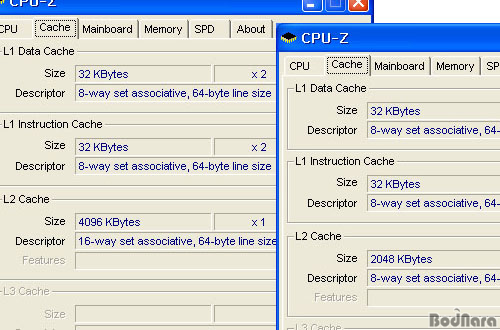 CPU-ZÀÇ Ä³½Ã ¸Þ¸ð¸® Á¤º¸¸¦ º¸¸é L1 ij½Ã ±¸Á¶´Â °°Áö¸¸ L2 ij½Ã´Â ¿ë·® »Ó¸¸ ¾Æ´Ï¶ó Core Duo¿¡¼­ 8-Way associative¿´´ø °ÍÀÌ Core 2 Duo¿¡¼­ 16-way associative·Î ¿Ã¶ó°£ °ÍÀ» º¼ ¼ö ÀÖ´Ù.
