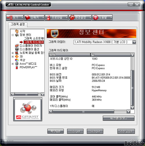 Mobility Radeon X1600ÀÇ Catalyst Control Center µî·Ï Á¤º¸¿¡´Â PCI Express ÀÎÅÍÆäÀ̽º¸¦ »ç¿ëÇϰí Hyper Memory¸¦ ÅëÇØ 512MB ¸Þ¸ð¸®¸¦ Áö¿øÇϸç, µ¿ÀÛ Å¬·°Àº ÄÚ¾î 446MHz, ¸Þ¸ð¸® 369(DDR 840)MHz·Î Ç¥±âµÇ¾î ÀÖ´Ù.