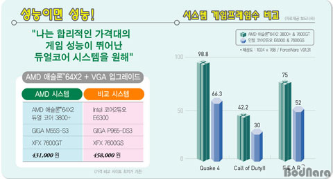 À§ÀÇ ±×¸²Àº ÇöÀå¿¡¼­ ¹èÆ÷µÈ Àü´ÜÁöÀÇ ³»¿ëÀ¸·Î ÀÎÅÚ ½Ã½ºÅÛ°ú ÇÕ¸®ÀûÀÎ °¡°Ý¿¡ µû¸¥ ¼º´É ºñ±³¸¦ ÇØ ³õ¾Ò´Ù. ¾ÆÁ÷Àº ³ôÀº °¡°Ý´ë¸¦ Çü¼ºÇϰí ÀÖ´Â P965 ¸ÞÀκ¸µå·Î ÀÎÇØ GeForce 7600GS¸¦ GeForce 7600GT·Î »ç¿ëÇÒ ¼ö ÀÖ´Ù´Â ÀåÁ¡À» ºÎ°¢½ÃÄ×´Ù.