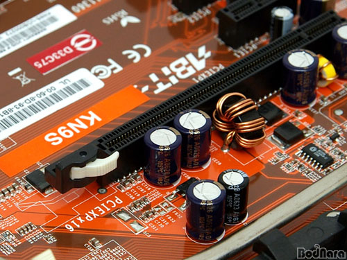 KN9 ½Ã¸®ÁîÀÇ PCI Express 16X ½½·ÔÀº ±×·¡ÇÈ Ä«µå¸¦ °íÁ¤ÇÒ ¼ö ÀÖ´Â °É¼èÀÇ ¹æÇâÀÌ »çÁøÃ³·³ ¼öÆòÀ¸·Î ³ª¿ÍÀÖ´Ù. °íÁ¤ °É¼è°¡ ¼öÁ÷À¸·Î µÇ¾î ÀÖÀ¸¸é Äð·¯°¡ Å« ±×·¡ÇÈ Ä«µå¸¦ ÀåÂøÇÒ °æ¿ì ½Ã½ºÅÛÀ» Á¶¸³ÇÑ »óÅ¿¡¼ °É¼è¸¦ ´©¸£±â°¡ »ó´çÈ÷ Èûµé´Ù.