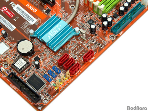 KN9S¿¡ »ç¿ëµÈ nForce 550 Ĩ¼ÂÀº IDE ä³ÎÀ» Çϳª·Î ÁÙ¿´À¸¸é¼µµ SATA II Æ÷Æ®´Â ±âÁ¸ nForce 4¿Í ¸¶Âù°¡Áö·Î 4°³¸¸ Á¦°øÇϰí ÀÖ¾î, ¸ÞÀκ¸µå¿¡¼ Á¦°øÇÏ´Â SATA Æ÷Æ®µµ 6°³¿¡¼ 4°³·Î ÁÙ¾îµé¾ú´Ù. IDE Ä¿³ØÅͳª USB È®Àå Çì´õ, FDD Ä¿³ØÅÍÀÇ À§Ä¡´Â º¯ÇÔ¾øÀ¸³ª SATA RAID ±â´ÉÀº RAID 0, 1, 0+1±îÁö¸¸ Áö¿øÇϰí RAID 5´Â Áö¿øÇÏÁö ¾Ê´Â´Ù.