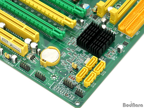 CMOS ¹èÅ͸®¿Í S-ATA 2.0 Áö¿ø 4Æ÷Æ®, USB 2.0 2Æ÷Æ®°¡ À§Ä¡Çϰí ÀÖ´Ù. ÇÁ·ÐÆ® ÆÐ³ÎÀº »ö»óÀ» Àû¿ëÇÏÁö