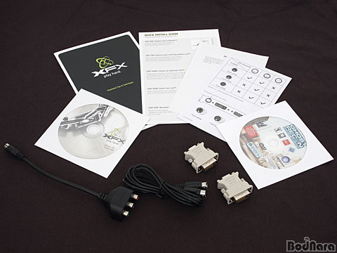 Á¦°øµÇ´Â ±¸¼º¹°Àº XFXÀÇ ¿µ¹® »ç¿ëÀÚ ¸Å´º¾ó°ú µå¶óÀ̹ö CD, Ãâ·Â Æ÷Æ®, Á¦°ø µå¶óÀ̹ö, ÁÖÀÇ »çÇ×ÀÌ Æ÷ÇÔµÈ °¡À̵å´Â °¢ ÇÑ À徿 Á¦°øµÇ°í ÄÄÆ÷³ÍÆ® ÄÉÀ̺í, S-VHS ÄÉÀ̺í, DVI to D-SUB º¯È¯ÀèÀ» Á¦°øÇÑ´Ù. ¹øµé·Î Ghost Recon °ÔÀÓÀ» Á¦°øÇÏ¿© TripleX ¹öÀüÀ¸·Î½áÀÇ °¡Ä¡¸¦ ³ô¿©ÁÖ°í ÀÖ´Ù. ´ë½Å, ÀÌ·± ¹øµéÀÇ Æ÷ÇÔÀ¸·Î ¿ø·¡ ³ô¾Ò´ø TripleX ¹öÀüÀÌ Á» ´õ ³ôÀº °¡°ÝÀ» Çü¼ºÇÏ°Ô µÇÁö¸¸, ³ôÀº ¼º´ÉÀ» ¿øÇÏ´Â »ç¿ëÀڵ鿡°Ô´Â Å©°Ô ¹®Á¦´Â µÇÁö ¾ÊÀ» °ÍÀÌ´Ù.
