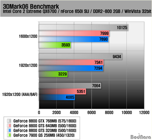 À©µµ¿ì ºñ½ºÅ¸ ȯ°æ¿¡¼­ ½ÇÇàÇÑ 3DMark06 º¥Ä¡¸¶Å© Å×½ºÆ® °á°ú °¡Àå ³ôÀº ½ºÆåÀ» °¡Áö°í ÀÖ´Â GeForce 8800 GTX 768MB°¡ µ¶º¸ÀûÀÎ 1À§¸¦ ±â·ÏÇÏ¿´À¸¸ç, GeForce 8800 GTS 640MB¿Í 320MB´Â 1920x1200 ÇØ»óµµ±îÁö´Â ¿ÀÂ÷¹üÀ§ ¼öÁØÀÇ ¼º´É Â÷À̸¦ ±â·ÏÇß´Ù.