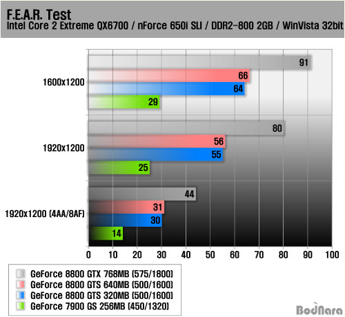 È£·¯ FPS¶ó´Â À帣·Î ¸¸µé¾îÁø F.E.A.R.´Â ÃÖ°í ¿É¼ÇÀ¸·Î ¼³Á¤ÇÑ Å×½ºÆ® °á°ú GeForce 8800 GTX 768MB°¡ ºÎµ¿ÀÇ 1À§¸¦ ±â·ÏÇÑ °¡¿îµ¥ GeForce 8800 GTS 640MB°¡ 2À§, 320MB ¹öÀüÀÌ ±Ù¼ÒÇÑ Â÷ÀÌ·Î 3À§¿¡ ¿Ã¶ú´Ù. GeForce 7900 GS 256MB´Â 1600x1200 ÀÌ»óÀÇ ÃÖ°í¿É¼Ç¿¡¼­ Á¤»óÀûÀ¸·Î °ÔÀÓÀ» Áñ±â±â´Â ¾î·Á¿ï °ÍÀÌ´Ù.