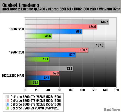 512MB ÀÌ»óÀÇ ±×·¡ÇÈ Ä«µå ¸Þ¸ð¸®¸¦ ±ÇÀåÇÏ´Â Quake4ÀÇ Ultra Quality ¿É¼ÇÀ¸·Î ŸÀÓµ¥¸ð Æò±Õ ÇÁ·¹ÀÓÀ» ÃøÁ¤ÇÑ °á°ú Company of Heros¿Í ¸¶Âù°¡Áö·Î ±×·¡ÇÈ Ä«µå ¸Þ¸ð¸® ¿ë·®ÀÌ 320MB ¹Û¿¡ µÇÁö ¾Ê´Â GeForce 8800 GTS 320MBÀÇ ¼º´É Â÷À̰¡ ³ªÅ¸³µ´Ù.