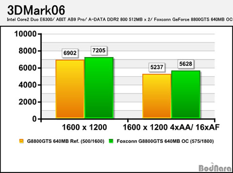 ±×·¡ÇÈ Ä«µå ¼º´É Å×½ºÆ®¿¡ ºüÁöÁö ¾Ê°í µîÀåÇÏ´Â 3DMark06À» Å×½ºÆ®¿¡ Æ÷ÇÔÇÏ¿´À¸¸ç, ºñ±³´Â ·¹ÆÛ·±½º 8800GTS 640MB¿Í ÁøÇàÇÏ¿´´Ù. °á°ú´Â ºñ·Ï, ½¦ÀÌ´õ Ŭ·°Àº »ó½ÂµÇÁö ¾Ê¾ÒÁö¸¸, ÄÚ¾î¿Í ¸Þ¸ð¸® Ŭ·°ÀÌ °¢°¢ 75MHz, 200MHz°¡ Áõ°¡µÇ¾ú±â ¶§¹®¿¡ ±×¸¸Å­ ¿À¹öŬ·°µÈ Foxconn 8800GTS 640MB OC ¹öÀüÀÌ AA¿Í AF¸¦ Àû¿ëÇÏÁö ¾ÊÀº »óȲ°ú AA¿Í AF¸¦ µ¿½Ã¿¡ Àû¿ëÇÑ »óȲº¸´Ù ³ôÀº ¼º´ÉÀ» º¸¿©ÁÖ¾ú´Ù. (AA : Anti-Aliasing, AF : Anisotropic Filtering (ºñµî¹æ¼º ÇÊÅ͸µ))