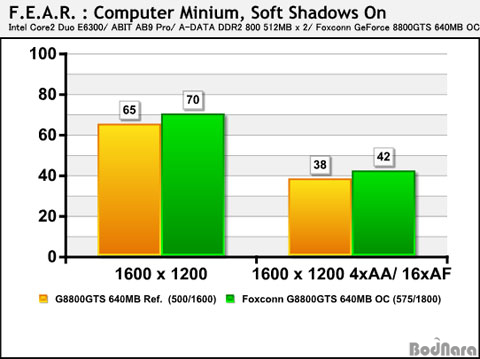 À̹ø¿¡´Â ¸¹Àº ½¦ÀÌ´õ ¿¬»êÀ» Æ÷ÇÔÇϰí ÀÖ´Â F.E.A.R.À» ÁøÇàÇÏ¿´´Ù. À̹ø °á°ú ¿ª½Ã µÎ °¡Áö ¼³Á¤ ¸ðµÎ¿¡¼­ ¾Õ¼­¿Í °°Àº °á°ú¸¦ ¾òÀ» ¼ö ÀÖ¾ú´Ù. °¢°¢ 5, 4 ÇÁ·¹ÀÓÀ» Foxconn 8800GTS 640MB OC ¹öÀüÀÌ ¾Õ¼­°í ÀÖ´Ù.