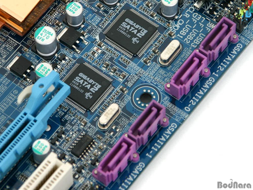 MCP ¿Ü¿¡ GIGABYTE SATA 2 ÄÁÆ®·Ñ·¯ 2°³¸¦ ´Þ¾Æ Ãß°¡·Î 4°³ÀÇ SATA II Æ÷Æ®¸¦ Á¦°øÇÑ´Ù. JMicronÀÇ °ÍÀ¸·Î º¸ÀÌ´Â ÀÌ ÄÁÆ®·Ñ·¯´Â GA-965P-DQ6¿¡´Â 1°³¸¸ µé¾î°¬À¸³ª N680SLI-DQ6¿¡´Â 2°³°¡ µé¾î°¡¸é¼­ MCPÀÇ SATA II Æ÷Æ®¸¦ ºô¸®Áö ¾Ê°íµµ Quad-eSATA¸¦ ±¸¼ºÇÒ ¼ö ÀÖ°Ô Çß´Ù. 2Æ÷Æ® ÄÁÆ®·Ñ·¯ 2°³·Î ±¸¼ºµÇ¾ú±â ¶§¹®¿¡ SATA RAID ±â´ÉÀº RAID 0, 1, JBOD¸¸ Áö¿øÇÑ´Ù.