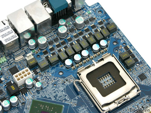 GIGABYTE GA-965P-DQ6¿¡¼­µµ °­Á¶µÇ¾ú´ø Virtual 12-Phase Àü¿øºÎ(GIGABYTE¿¡¼­´Â 6-Quad Ư¡¿¡ ¸Â°Ô Quad Triple(4x3) Phase·Î ¸í½Ã)¸¦ À¯ÁöÇϰí ÀÖ´Ù. ÀÌ Àü¿øºÎ´Â ½ÇÁ¦·Î´Â 6-Phase¸¦ Áö¿øÇÏ´Â Intersil ISL6327 PWM ÄÁÆ®·Ñ·¯¸¦ µà¾ó MosfetÀ¸·Î ±¸¼ºÇØ 12-Phase¿Í µ¿ÀÏÇÑ ±¸¼ºÀÌ Àû¿ëµÇµµ·Ï ¼³°èÇÑ °ÍÀÌ´Ù.