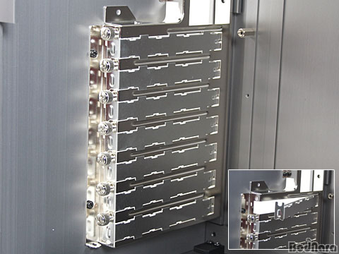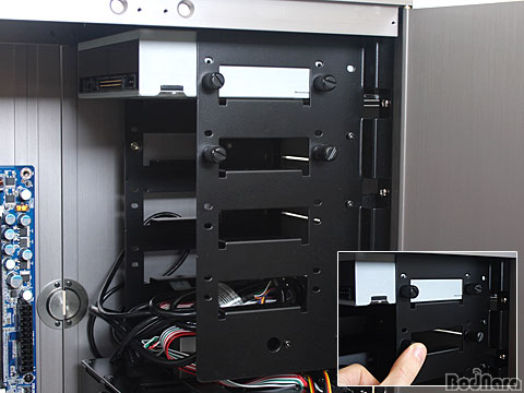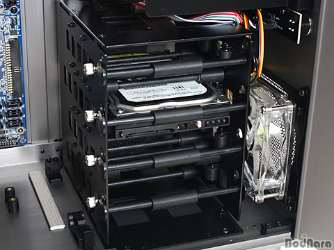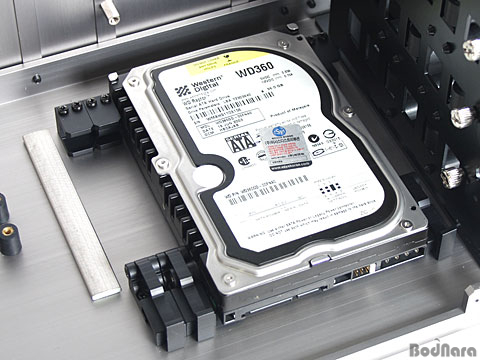 HDD¸¦ ÀåÂøÇÏ´Â ¹æ½ÄÀº º¸µå³ª¶ó ±â»çÀÎ FATAL1TY ºê·£µå´Â °è¼ÓµÈ´Ù. Zalman FC-ZE1¿¡¼­ »ìÆìº» °Í°ú µ¿ÀÏÇÑ ¹æ½ÄÀÌ »ç¿ëµÇ°í ÀÖ´Ù. Çϵåµð½ºÅ©¸¦ ¼ÕÀ¸·Î °¡º±°Ô ¹Ð¾îÁÖ¸é ·Ñ·¯µé¿¡ ÀÇÇØ ½±°Ô ³»ºÎ·Î ÀåÂøµÇ°í ³¡¿¡ À§Ä¡ÇÑ È¸ÀüµÇ´Â Àá±Ý ÃàÀ¸·Î Çϵåµð½ºÅ©¸¦ °íÁ¤ÇØÁÖ´Â ¹æ½ÄÀÌ´Ù. À̸¦ ÅëÇØ Çϵåµð½ºÅ©ÀÇ Áøµ¿ ¿ª½Ã ÃÖ¼ÒÈ­ÇÒ ¼ö ÀÖ´Â ±¸¼ºÀ» º¸¿©ÁØ´Ù.