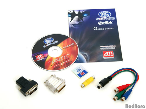 SAPPHIRE HD 2600 XT D4 256MB¿¡´Â ±×·¡ÇÈ Ä«µå ¿Ü¿¡ »ç¿ëÀÚ ¸Å´º¾ó, µå¶óÀ̹ö CD, DVI to HDMI º¯È¯ Á¨´õ, DVI to D-SUB º¯È¯ Á¨´õ, ÄÄÆ÷ÁöÆ® ºñµð¿À º¯È¯ Á¨´õ¿Í ÄÄÆ÷³ÍÆ® Ãâ·Â ÄÉÀ̺íÀÌ Á¦°øµÈ´Ù. ±×·¯³ª SAPPHIRE HD 2600 XT D4 256MB¿¡´Â CrossFire ÄÉÀ̺íÀÌ ºüÁ® ÀÖÀ¸¹Ç·Î CrossFire ±¸¼ºÀ» À§Çؼ­´Â ÄÉÀ̺íÀÌ 2°³ µé¾î°£ ¹öÀüÀ» ã°Å³ª ÄÉÀÌºí º°µµ ±¸¸Å°¡ ÇÊ¿äÇÒ °ÍÀ¸·Î º¸ÀδÙ.