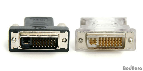 SAPPHIRE HD 2600 XT D4 256MB¿¡ Á¦°øµÇ´Â DVI to HDMI º¯È¯ Á¨´õ¿Í DVI to D-SUB º¯È¯ Á¨´õ¸¦ ºñ±³Çغ¸¸é D-SUB º¯È¯ Á¨´õ ÂÊ¿¡ ¾Æ³¯·Î±× RGB Ãâ·ÂÀ» À§ÇÑ ÇÉÀÌ Ãß°¡·Î ´Þ·ÁÀÖ°í, HDMI º¯È¯ Á¨´õ´Â DVI-D ±Ô°Ý°ú ¶È°°ÀÌ »ý°å´Ù.
