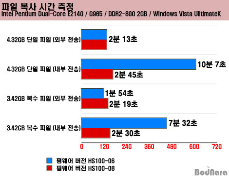 HS100-06 Æß¿þ¾î Á¦Ç°Àº À¯ÀÏÇÏ°Ô 3.42GB ¿ë·®ÀÇ ¾à 5,000°³ ¼ö·®ÀÇ ÆÄÀÏÀ» ¿ÜºÎ Çϵ忡¼­ º¹»çÇϴµ¥ °É¸®´Â ½Ã°£Àº ÁÁ¾ÒÁö¸¸ ´ÜÀÏ ÆÄÀÏÀ̳ª º¹¼ö ÆÄÀÏÀ̳ª ¸ðµÎ ³»ºÎ Àü¼Û¿¡¼­´Â »ó´çÇÑ ¼º´É ÀúÇϰ¡ ¹ß»ýÇÑ´Ù´Â °á°ú°¡ ³ª¿Ô´Ù. ƯÈ÷, 2.5ÀÎÄ¡ ÇÏµå µð½ºÅ©ÀÇ ÁÖ¿ä »ç¿ëóÀÎ ³ëÆ®ºÏÀº ´ëºÎºÐ 1°³ÀÇ HDD·Î Á¦Ç°À» ±¸¼ºÇϹǷΠSpinpoint M5S 250GBó·³ ´ë¿ë·® Çϵå 1°³¸¦ 2°³ ÀÌ»óÀÇ ÆÄƼ¼ÇÀ¸·Î ³ª´²¼­ »ç¿ëÇÏ°Ô µÈ´Ù¸é ³»ºÎ ÆÄƼ¼Ç »çÀÌ¿¡ µ¥ÀÌÅÍ Àü¼ÛÀÌ ÀϾ ¶§ ÀÏ¹Ý Á¦Ç°º¸´Ù ½Ã°£ÀÌ Áö¿¬µÉ °¡´É¼ºÀÌ ÀÖ´Ù.