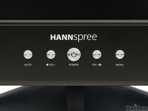 Hannspree¶ó´Â ºê·£µå À̸§ ¾Æ·¡·Î µ¿±×¶õ OSD ¹öư 5°³°¡ º¸À̴µ¥, °¡¿îµ¥ ÀÖ´Â °¡Àå Å« Àü¿ø ¹öư¿¡´Â LED°¡ µé¾îÀÖ¾î ¸ð´ÏÅÍÀÇ »óŸ¦ ½±°Ô È®ÀÎÇÒ ¼ö ÀÖ´Ù. ³ª¸ÓÁö 4°³ÀÇ ¹öưÀ¸·Î´Â OSD ¸Þ´º Á¶ÀÛ°ú ½ºÇÇÄ¿ º¼·ý Á¶ÀýÀÌ °¡´ÉÇÏ´Ù.