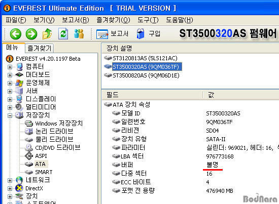 ½ÇÁ¦·Î ¸ð´ÏÅ͸µ ÇÁ·Î±×·¥¿¡ Á¤º¸°¡ ¾ø´Â ST3500320AS ¹öÀüÀÇ Á¤»óÀûÀÎ ¹Ù¶óÄí´Ù 7200.11 500GB ¸ðµ¨Àº ¹öÆÛ ¸Þ¸ð¸®¸¦ ¾Ë ¼ö ¾ø´Ù´Â ³»¿ëÀÌ ³ª¿Â´Ù.