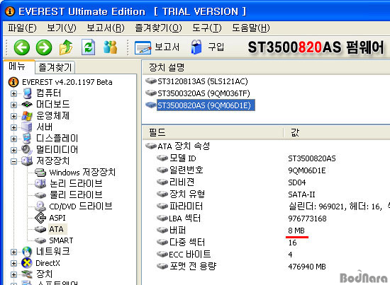 ±×¸®°í ¹®Á¦ÀÇ ST3500820AS ¹öÀüÀÇ Çϵå´Â Everest³ª HD Tune°ú °°Àº À¯ÀúµéÀÌ ºÎǰ Á¤º¸¸¦ ½±°Ô ÆÄ¾ÇÇÒ ¼ö ÀÖ´Â ÇÁ·Î±×·¥¿¡¼­ 8MB ¸Þ¸ð¸®¸¦ °¡Áø °ÍÀ¸·Î Ç¥½ÃµÈ´Ù. À̰ÍÀº ¿ø·¡ ST3500820AS¶ó´Â ¹ÙÀÌ¿À½º ¹öÀüÀÌ 8MB ¸Þ¸ð¸®¸¦ °¡Áø Çϵå¿ë ¹ÙÀÌ¿À½º¿´À½¿¡µµ ºÒ±¸Çϰí 32MB ¸ðµ¨¿¡ »ç¿ëµÇ¸é¼­ ÇÁ·Î±×·¥¿¡¼­ ÇØ´ç Á¤º¸¸¦ ¹ÙÅÁÀ¸·Î º¸¿©Áֱ⠶§¹®ÀÌ´Ù.