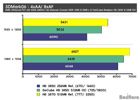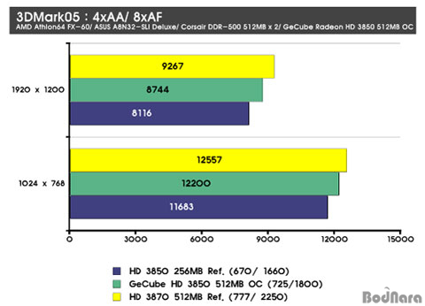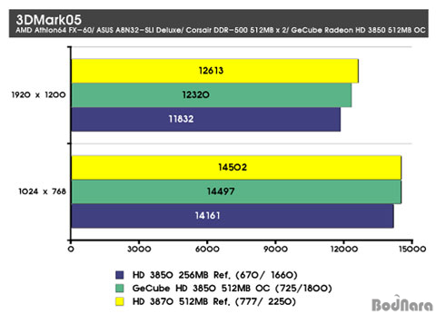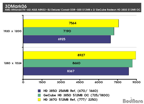 GeCube HD 3850 X-Turbo III OC Edition DDR3 512MB´Â ¾Õ¼­µµ ¾ð±ÞÇÏ¿´µíÀÌ HD 3850 ·¹ÆÛ·±½º¿Í ºñ±³ÇÏ¿© ³ô¾ÆÁø ÄÚ¾î¿Í ¸Þ¸ð¸® Ŭ·°, ±×¸®°í ´Ã¾î³­ ¸Þ¸ð¸® ¿ë·®À» °¡Áø´Ù°í ÇÏ¿´´Âµ¥ ÀÌ¿¡ µû¶ó HD 3850 ·¹ÆÛ·±½ºº¸´Ù ´õ ³ôÀº ¼º´ÉÀÌ ³ªÅ¸³µ´Ù. ¼º´ÉÀ¸·Î º¸¸é Ŭ·° Çâ»ó°ú ¸Þ¸ð¸® Áõ°¡¿¡ µû¶ó HD 3850 ·¹ÆÛ·±½º¿Í HD 3870 ·¹ÆÛ·±½ºÀÇ Áß°£ ¼º´ÉÀ» °¡Áö°í ÀÖ´Ù. CPUÀÇ ¿µÇâÀÌ Å©´Ù°í º¼ ¼ö ÀÖ´Â ÀúÇØ»óµµÀÎ 1024 x 768ÀÇ ÇØ»óµµ¿¡¼­´Â GeCube HD 3850 X-Turbo III OC Edition DDR3 512MB°¡ HD 3870 ·¹ÆÛ·±½º¿Í ¿ÀÂ÷¹üÀ§¿¡ °¡±î¿ï Á¤µµ·Î ÀûÀº Â÷À̸¦ º¸¿´°í °íÇØ»óµµ ¿ª½Ã ±Ù¼ÒÇÑ Â÷ÀÌ·Î HD 3870 ·¹ÆÛ·±½º¸¦ µû¶óÀâ°í ÀÖ´Ù.