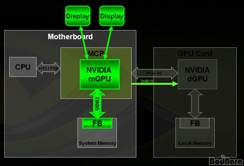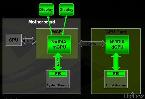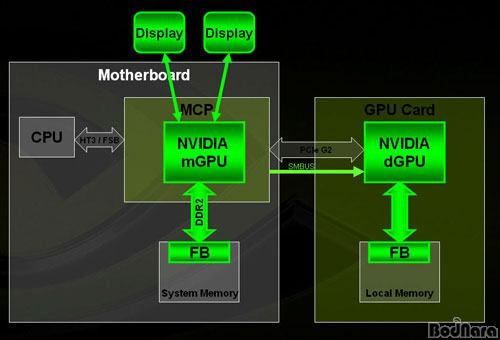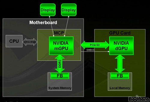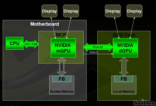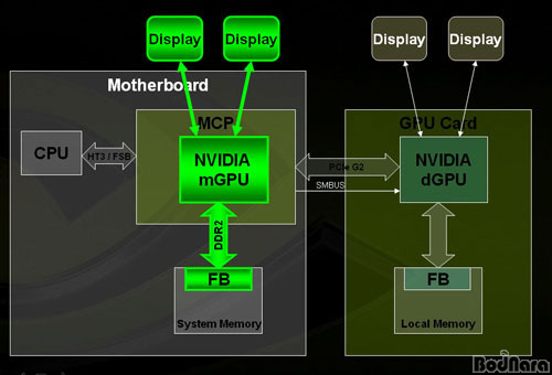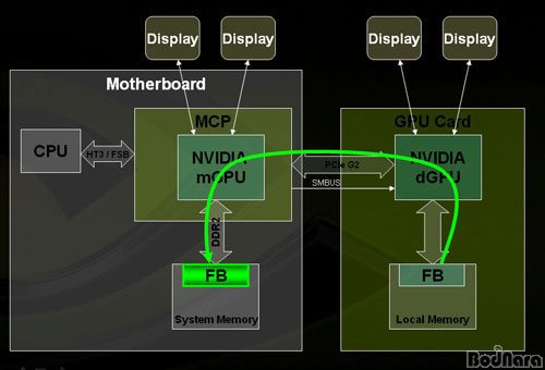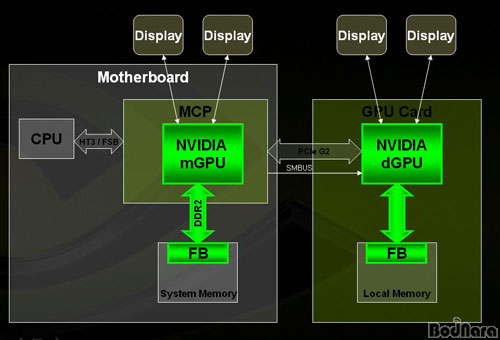 mGPU¸¦ °ÅÃļ ÀÌ·ïÁö±â ¶§¹®¿¡ ¿ÜºÎ ±×·¡ÇÈ Ä«µå´Â ÀÛ¾÷ÇÑ µ¥ÀÌÅ͸¦ PCI Express 2.0 ÀÎÅÍÆäÀ̽º¸¦ ÅëÇØ ½Ã½ºÅÛ ¸Þ¸ð¸®¿¡ ÇÒ´çµÈ
