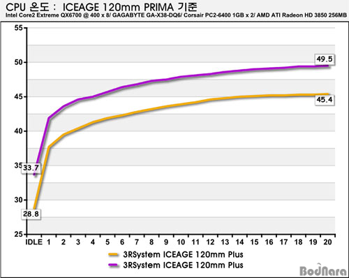 Intel Core2 Extreme QX6700À» FSB 400¿¡ ¼³Á¤Çϰí 8¹è¼ö¸¦ Àû¿ëÇßÀ¸¸ç, ±âº» Àü¾ÐÀ» 1.45V·Î ³ô¿© ¹ß¿­ÀÌ Àß µÇµµ·Ï ¼³Á¤Çß´Ù. ÄÉÀ̽º ÀÚü ¿Âµµ¿Í ¼ÒÀ½ Å×½ºÆ®´Â Àý´ë ºñ±³ Å×½ºÆ®°¡ ¾Æ´Ñ »ó´ë ºñ±³ Å×½ºÆ®À̸ç, ICEAGE 120mm PRIMA °¡ °¡Áö°í ÀÖ´Â ¼º°ÝÀ» È®ÀÎÇϱâ À§ÇÑ Å×½ºÆ®À̹ǷΠPRIME 95À» ÀÌ¿ëÇÑ CPU Ç® ·Îµå(Full Load)½Ã ¹ß»ýÇÏ´Â ¿­¿¡ ´ëÇÑ ¹ß¿­ Å×½ºÆ®¸¸ È®ÀÎÇßÀ½À» ¹àÈù´Ù.