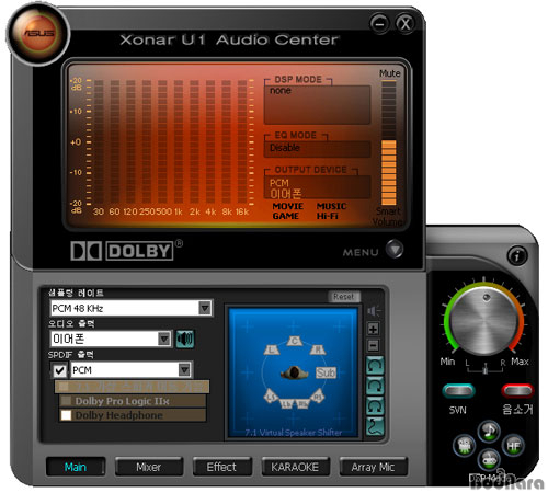 Xonar U1ÀÇ ¿Àµð¿À ¼¾ÅÍ ÇÁ·Î±×·¥Àº ÀÌÄ÷¶óÀÌÀú¿Í DSP ¸ðµå, EQ ¸ðµå, Ãâ·Â ¼³Á¤, º¼·ý¹Ù°¡ ÀÖ´Â µð½ºÇ÷¹ÀÌ¿Í ¿ìÃø¿¡ ÀÖ´Â º¼·ý ´ÙÀ̾ó, ³ë¸Ö¶óÀÌÁî ¹× À½¼Ò°Å ¹öư, ±×¸®°í 4°³ÀÇ DSP ¸ðµå ¹öưÀ» °¡Áö°í ÀÖ´Ù.
