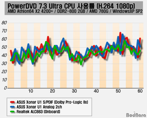 Å×½ºÆ® °á°ú Realtek ALC883 ÄÚµ¦À» ¾´ ¿Âº¸µå »ç¿îµå´Â Æò±Õ CPU »ç¿ë·üÀÌ 43.56%¿´À¸¸ç, USB·Î ¿¬°áÇÑ ASUS Xonar U1Àº ¾Æ³¯·Î±× 2ä³Î Ãâ·ÂÀ¸·Î´Â 46.61%, SPDIF µ¹ºñ ÇÁ·Î·ÎÁ÷ IIx Ãâ·ÂÀº 46.93%·Î ³»Àå »ç¿îµåº¸´Ù ¾à°£ ³ô±ä ÇßÁö¸¸ Å« Â÷ÀÌ´Â ¾ø¾ú´Ù.