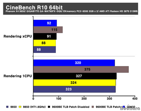·»´õ¸µÀ» ÁøÇàÇÏ´Â CineBench R10 64bit¿¡¼ ¿ª½Ã TLB ÆÐÄ¡¸¦ Àû¿ëÇÏ¿´À» ¶§ ½Ì±Û°ú ¸ÖƼ CPU »ç¿ë