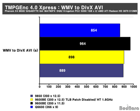 Å×½ºÆ® °á°ú 9850BE´Â Q6600º¸´Ù ´À¸®°Ô º¯È¯À» ¿Ï·áÇÏ¿´À¸¸ç, ÀÌ´Â DivX ÄÚµ¦°ú TMPGEnc 4.0