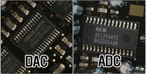 DAC´Â Cirrus LogicÞäÀÇ CS4398 ³× °³¸¦, ADC´Â AsahiKasei AK5394A¸¦ ÇÑ °³ »ç¿ëÇß´Ù. ¼Ò¸®¸¦ Ãâ·ÂÇϱâ À§ÇÑ CS4398Àº ÃÖ´ë 24bit/192kHz¸¦ Áö¿øÇÏ´Â ½ºÅ×·¹¿À(2ä³Î) Á¦Ç°À¸·Î X-Fi Elite Pro¿¡ ³× °³¸¦ »ç¿ëÇØ 8ä³Î(7.1ä³Î) Ãâ·ÂÀ» Áö¿øÇÏ°Ô µÈ´Ù. ¶ÇÇÑ, ADC·Î »ç¿ëµÈ AK5394´Â 24bit/192kHz¸¦ Áö¿øÇÏ´Â 2ä³Î Á¦Ç°À¸·Î ÃÖ´ë ½ÅÈ£´ë ÀâÀ½ºñ´Â 123dB¸¦ Áö¿øÇÏ´Â °í±ÞÇü AD-ÄÁ¹öÅÍ ÀÌ´Ù.