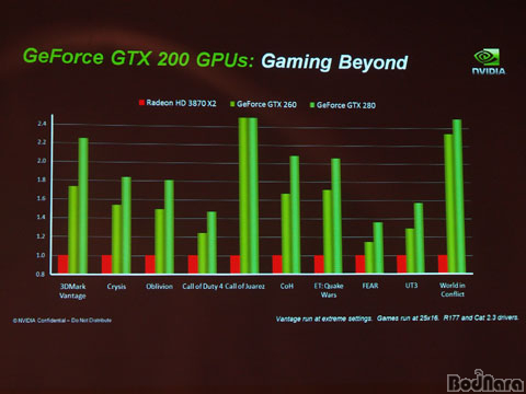 "GeForce GTX 200 ½Ã¸®ÁîÀÇ ¼º´ÉÀº ´Ù¾çÇÑ °ÔÀӵ鿡¼­ ±âÁ¸ °æÀï»çÀÇ µà¾ó GPU Ä«µå¸¦ ÈξÀ ³Ñ¾î¼­´Â ¼º´ÉÀ» °®Ãß°í ÀÖÀ½À» ¼Ò°³Çß´Ù. AMDÀÇ µà¾ó GPUÀÎ ATI Radeon HD 3870 X2¸¦ 1·Î º¸¾ÒÀ» ¶§ ½Ì±Û GeForce GTX 200 ½Ã¸®ÁîµéÀº À̸¦ ÈξÀ ¶Ù¾î ³Ñ´Â ó¸® ¼º´ÉÀ» °®°í ÀÖÀ½À» Â÷Æ®¸¦ ÅëÇØ È®ÀÎÇÒ ¼ö ÀÖ´Ù."