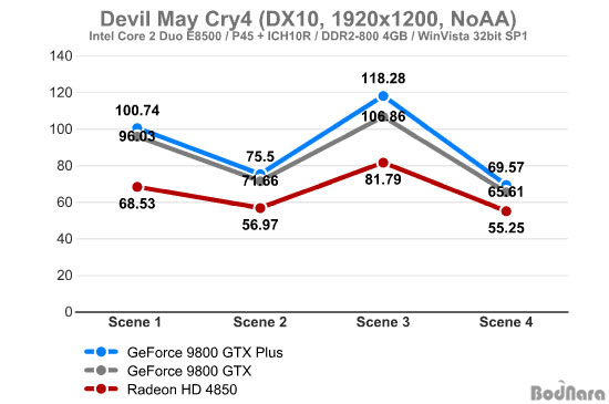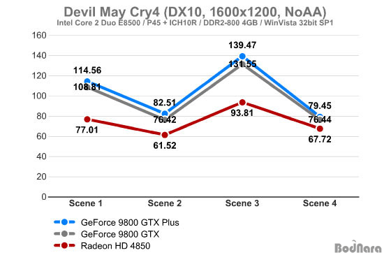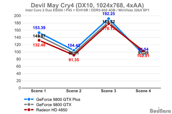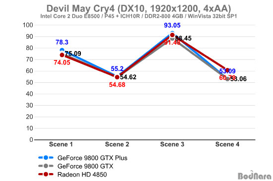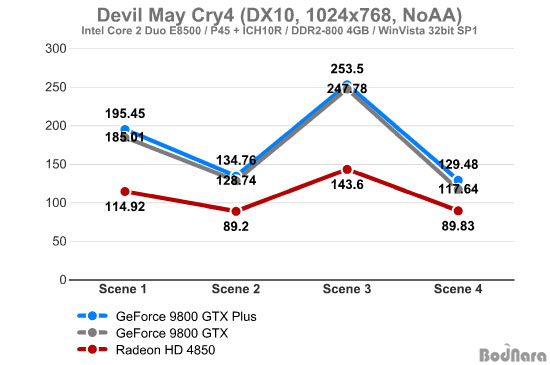 ¶óµ¥¿Â HD 4850ÀÌ ÁöÆ÷½º 9800 GTX ½Ã¸®Áî¿Í ºñ½ÁÇÏ°Ô ¼º´ÉÀÌ ¿Ã¶ó°¡¸ç, Scene 4ÀÇ °æ¿ì´Â ¶óµ¥¿Â HD 4850°ú ÁöÆ÷½º 9800