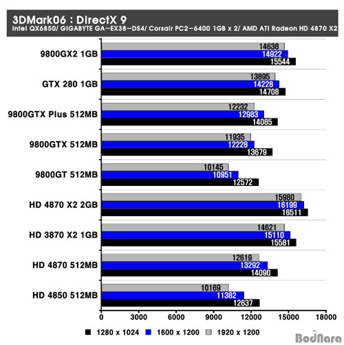 DirectX 9 ȯ°æ¿¡¼­ ±×·¡ÇÈ Ä«µåµéÀÇ ¼º´ÉÀ»  È®ÀÎÇØº¼ ¼ö ÀÖ´Â 3DMark06À» Å×½ºÆ®Çغ¸¾Ò´Ù. Å×½ºÆ® °á°ú HD 4870 X2´Â µà¾ó GPU ±¸¼ºÀÎ HD 3870 X2¸¦ ºñ·ÔÇÏ¿© °æÀï»çÀÇ µà¾ó GPUÀÎ 9800 GX2¸¦ ³Ñ¾î¼­´Â ³ôÀº ¼º´ÉÀ» º¸¿©ÁÖ°í ÀÖ´Ù.