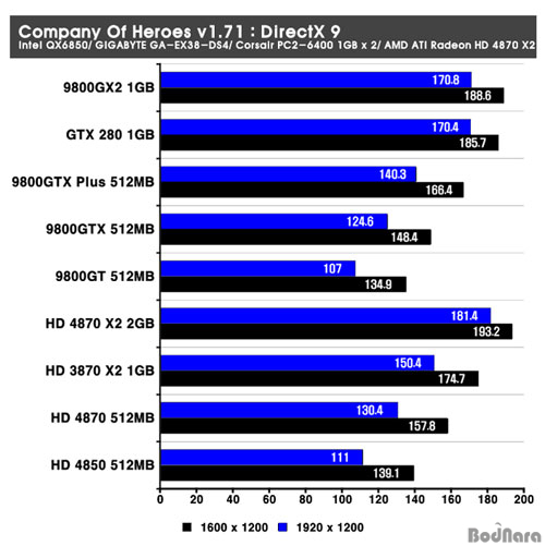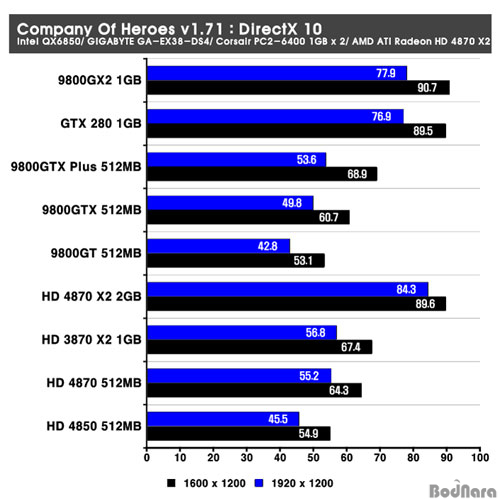 Company Of Heroes v1.71 ÆÐÄ¡¸¦ Àû¿ëÇÒ °æ¿ì DirectX 9¿Í 10 ¸ðµå¸¦ ¸ðµÎ ÁøÇàÇÒ ¼ö ÀÖ´Ù. Å×½ºÆ® °á°ú DirectX 9 ȯ°æ¿¡¼­´Â Àü¹ÝÀûÀ¸·Î AMD ATI Á¦Ç°±ºÀÌ ¿ì¼öÇÑ ÆíÀε¥ HD 4870 X2´Â HD 3870 X2¸¦ ³Ñ¾î °æÀï»çÀÇ 9800 GX2³ª GeForce GTX 280À» ¸ðµÎ ³Ñ¾î¼­´Â ³ôÀº ¼º´ÉÀ» º¸¿©ÁÖ°í ÀÖ´Ù. DirectX 10 ȯ°æ¿¡¼­´Â GeForce Á¦Ç°±ºÀÇ ¼º´ÉÀÌ Á¶±Ý ´õ ¾Õ¼­°í Àִµ¥ HD 4870 X2´Â 1920 x 1200ÀÇ °íÇØ»óµµ¿¡¼­ °æÀï»ç¸¦ ¾Õ¼­´Â ¼º´ÉÀ» º¸¿©ÁÖ°í ÀÖ´Ù.