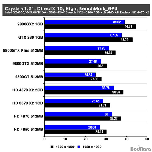 Crysis´Â °í¼º´É ±×·¡ÇÈ Ä«µåµé¿¡¼­µµ ÇÁ·¹ÀÓÀÌ ³ôÁö ¾ÊÀº °ÔÀÓ ÁßÀÇ Çϳª·Î Å×½ºÆ®µÈ DirectX 10 ȯ°æ¿¡¼­µµ ¸¶Âù°¡ÁöÀÇ °á°ú¸¦ º¸¿©ÁÖ°í ÀÖ´Ù. HD 4870 X2´Â HD 3870 X2¿Í ºñ±³ÇÏ¸é ³ôÀº ¼º´ÉÀ» ³ªÅ¸³»°í ÀÖÀ¸³ª HD 4870°ú ºñ±³ÇÏ¿© Å« Çâ»óÀº ³ªÅ¸³ªÁö ¾Ê´Â °á°ú¸¦ º¸¿©ÁÖ°í ÀÖ´Ù. NVIDIA Á¦Ç°µéÀÌ Àü¹ÝÀûÀ¸·Î ³ôÀº ¼º´ÉÀ» ³ªÅ¸³Â´Ù.