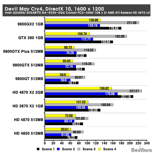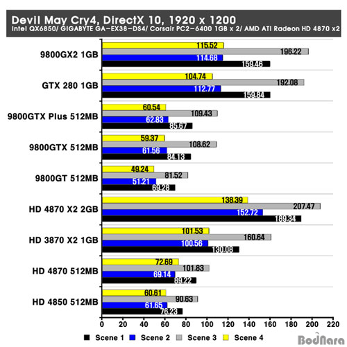 Devil May Cry4´Â DirectX 9¿Í 10À» ¸ðµÎ Áö¿øÇϰí ÀÖÀ¸¸ç, ÃÖ±Ù ±×·¡ÇÈ Ä«µåµéÀÇ ¼º´É Å×½ºÆ®¿¡ »ç¿ëµÈ´Ù. 1600 x 1200ÀÇ ÇØ»óµµ¿¡¼­´Â NVIDIA Á¦Ç°±ºÀÌ ¾Õ¼­´Â ¸ð½ÀÀ» º¸¿´°í µà¾ó GPUÀÎ HD 3870 X2µµ ¼±ÀüÇØÁÖ°í ÀÖ´Ù. HD 4800 ½Ã¸®ÁîÀÇ °æ¿ì AA/ AF¸¦ Àû¿ëÇÏÁö ¾ÊÀ» ¶§ ¼º´ÉÀÌ ÀúÇϵǴ ¸ð½ÀÀ» º¸¿©ÁÖ°í Àִµ¥ HD 4870 X2ÀÇ °æ¿ì µà¾ó GPU ±¸¼ºÀ¸·Î °æÀï»çÀÇ µà¾ó GPU ±¸¼ºÀÎ 9800 GX2¸¦ ³Ñ¾î¼­´Â ³ôÀº ¼º´ÉÀ» º¸¿©ÁØ´Ù. 1920 x 1200 ÇØ»óµµ¿¡¼­ ¿ª½Ã HD 4870 X2´Â HD 4800 ½Ã¸®Áîµé°ú ´Þ¸® ¿©ÀüÈ÷ °æÀï»ç¸¦ ¾Õ¼­´Â ³ôÀº ¼º´ÉÀ» º¸¿©ÁÖ°í ÀÖ´Ù.
