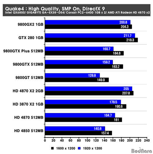 Quake4´Â ¸ÖƼ ÄÚ¾î¿Í OpenGLÀ» ±â¹ÝÀ¸·Î Çϰí ÀÖ´Â °ÔÀÓÀ¸·Î 1.4.2 ÆÐÄ¡¸¦ Àû¿ëÇÑ »óȲ¿¡¼­ÀÇ °á°úÀÌ´Ù. Å×½ºÆ® °á°ú HD 4870 X2´Â °æÀï»çÀÇ µà¾ó GPU ±¸¼ºÀÎ 9800 GX2¿Í GeForce GTX 280¿¡ ±ÙÁ¢ÇÒ Á¤µµ·Î ³ôÀº ¼º´ÉÀ» ³ªÅ¸³Â°í HD 3870 X2º¸´Ù Çâ»óµÈ ¼º´ÉÀ» ³ªÅ¸³Â´Ù.