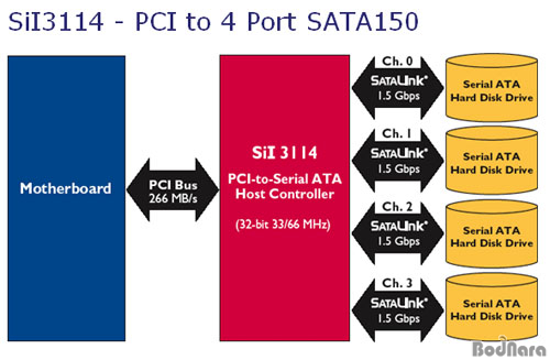 Silicon Image»çÀÇ SteelVine SiI3114 Ĩ¼ÂÀÌ µé¾î°¬´Ù. ÀÌ Ä¨¼ÂÀº 32bit PCI ÀÎÅÍÆäÀ̽º¸¦ »ç¿ëÇØ 4°³ÀÇ SATA