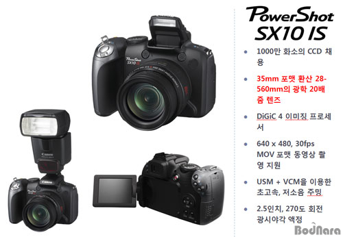 ÆÄ¿ö¼¦ SX10 IS´Â SX1 ISó·³ 1000¸¸ ȼҸ¦ Áö¿øÇϴ ¸ðµ¨·Î 28-560mm ±¤ÇÐ 20¹èÁÜ ¹× USM+VCM Áö¿ø ·»Áî žÀç µî µðÀÚÀΰú ±âº» ±â´ÉÀº ºñ½ÁÇÏÁö¸¸ Ç®HD µ¿¿µ»óÀÌ ¾Æ´Ñ 640x480 µ¿¿µ»ó ÃÔ¿µ¸¸ Áö¿øÇϸç, ¾×Á¤ Å©±âµµ SX1 ISº¸´Ù ÁÙ¾îµç 2.5ÀÎġ¥¸®·Î ¹Ù²î¾ú´Ù.  ÆÄ¿ö¼¦ SX10 IS´Â »óÀ§ ¸ðµ¨ÀÎ SX1 ISº¸´Ù ºü¸¥ 10¿ù Ãâ½Ã ¿¹Á¤ÀÌ¸ç °¡°ÝÀº 40¸¸¿ø´ë ÈĹÝ.