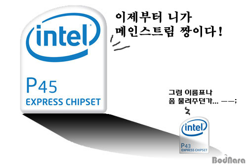 ÀÎÅÚÀº ÄÚ¾î 2 ½Ã¸®Áî¿Í ÇÔ²² Àα⸦ ¾òÀº 3 ½Ã¸®Áî Ĩ¼ÂÀÇ µÚ¸¦ À̾î 4 ½Ã¸®Á ³»³õ¾ÒÁö¸¸, 3 ½Ã¸®Áî±îÁö ÁÖ·ÂÀ̾ú´ø P35¸¦ ´ë½ÅÇØ P45°¡ ¾Æ´Ñ P43À» ÁÖ·ÂÀ¸·Î Ã¥Á¤Çϸ鼭 È¥¶õÀ» ÁÖ¾ú´Ù. ÀÌÀü±îÁö ÀÎÅÚÀº µ¥½ºÅ©Å¾ ½ÃÀå¿¡¼­ ¸ÞÀνºÆ®¸²±Þ Ĩ¼Â¿¡°Ô´Â i865, i915, i945, P965, P35¿Í °°Àº ¸¶Áö¸· ¼ýÀÚ°¡ 5·Î ³¡³ª´Â À̸§À» ºÎ¿©ÇßÀ¸³ª, 4 ½Ã¸®Áî·Î ¿À¸é¼­ P45¸¦ ÁØ ÇÏÀÌ¿£µå±ÞÀ¸·Î ¿Ã¸®°í ¸ÞÀνºÆ®¸² ½ÃÀå¿¡ P43À» ³»³õ¾Ò´Ù.
