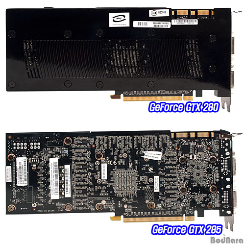 GeForce GTX 285ÀÇ Å©°Ô ´Þ¶óÁø ºÎºÐÀº ¹Ù·Î 65nm¿¡¼ 55nm·Î °³¼±µÈ °øÁ¤À» Àû¿ëÇÑ GPU¸¦ »ç¿ëÇÏ´Â °ÍÀÌ´Ù. 55nm°¡ Àû¿ëµÈ GTX 285´Â G200-350-B3·Î ¸¶Å·µÇ¾î ÀÖÀ¸¸ç, Áö³ ±â»çÀÇ 65nm GTX 280ÀÌ G200-300-A2°¡ ¸¶Å·µÇ¾ú´ø °Í°ú Â÷À̸¦ º¸ÀδÙ. Âü°í·Î »óÀ§ Á¦Ç°ÀÎ GTX 295´Â G200-400-B3°¡ ¸¶Å·µÈ´Ù. GPU º¸È£¿Í ¿Àü´ÞÀ» À§ÇÑ È÷Æ®½ºÇÁ·¹´õ »ç¿ë µîÀº Â÷À̰¡ ¾ø´Ù.