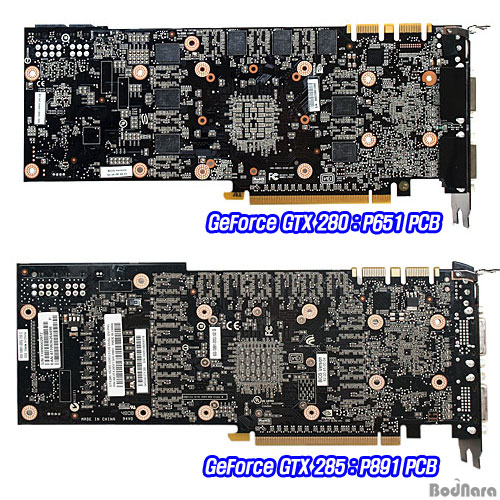 55nm GeForce GTX 285´Â 65nm GeForce GTX 280ÀÌ P651 PCB¸¦ »ç¿ëÇÏ´Â °Í°ú ´Þ¸® »õ·Ó°Ô µðÀÚÀÎµÈ P891 PCB¸¦ ·¹ÆÛ·±½º µðÀÚÀÎÀ¸·Î »ç¿ëÇÑ´Ù. ¿ÜÇüÀûÀ¸·Î Å©°Ô ´Þ¶óÁø ºÎºÐÀº Àü¿øºÎ¿Í ¸Þ¸ð¸® ¹èÄ¡, º¸Á¶Àü¿ø Ä¿³ØÅÍ ±¸¼º ºÎºÐÀÌ´Ù.