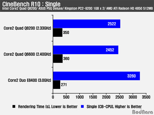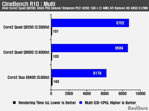 CPU ·»´õ¸µ ¼º´ÉÀ» È®ÀÎÇÒ ¼ö ÀÖ´Â CineBench R10Àº ½Ì±Û¿¡¼´Â Ŭ·°ÀÌ °¡Àå ³ô¾Ò´ø µà¾ó ÄÚ¾îÀÎ E8400ÀÇ ·»´õ¸µ ¼º´ÉÀÌ ¿ì¼öÇß°í ÀÌ¾î¼ Å¬·°ÀÌ Á¶±Ý ³·Áö¸¸, 45nm °øÁ¤ÀÇ Q8200ÀÌ µÚ¸¦ À̾ú°í Q6600ÀÇ Ã³¸® ¼º´ÉÀÌ °¡Àå ³·¾Ò´Ù. ¸ÖƼ Äھ Ȱ¿ëÇÏ´Â °æ¿ì´Â Äõµå Äھ Àü¹ÝÀûÀ¸·Î À¯¸®ÇßÀ¸¸ç, À̹ø¿¡µµ Ŭ·°Àº ³·À¸³ª °øÁ¤°ú ³»ºÎ ó¸® ¼º´ÉÀÌ °³¼±µÈ Q8200ÀÌ Q6600À» ±Ù¼ÒÇÏ°Ô ¾Õ¼³ª°¡°í ÀÖ´Ù.
