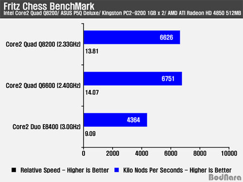 Fritz Chess Benchmark´Â CPUÀÇ ±âº» ¿¬»ê ¼º´ÉÀ» È®ÀÎÇØº¼ ¼ö ÀÖ´Â ÇÁ·Î±×·¥À¸·Î ¸ÖƼ ÄÚ¾î CPU¸¦ Áö¿øÇϰí ÀÖ´Ù. µû¶ó¼, µà¾ó Äھ´Ù´Â Äõµå Äھ ´õ ³ôÀº ó¸® ¼º´ÉÀ» È®ÀÎÇÒ ¼ö Àִµ¥ ½ÇÁ¦·Î Å×½ºÆ® °á°úµµ ´õ ³ôÀº Ŭ·°À» °¡Áø µà¾ó Äھ Q8200°ú Q6600º¸´Ù ³·Àº ó¸® ¼º´ÉÀ» º¸¿´´Ù. Äõµå ÄÚ¾î °£¿¡´Â ¾à°£ÀÇ Å¬·°°ú L2 ij½¬°¡ ´õ ¸¹Àº Q6600 (L2 8MB)ÀÌ Q8200 (L2 4MB)À» ¾à°£ ´õ ¾Õ¼± ó¸® ¼º´ÉÀ» Á¦°øÇϰí ÀÖÀ¸³ª ±× Â÷ÀÌ´Â Å©Áö ¾Ê´Ù.